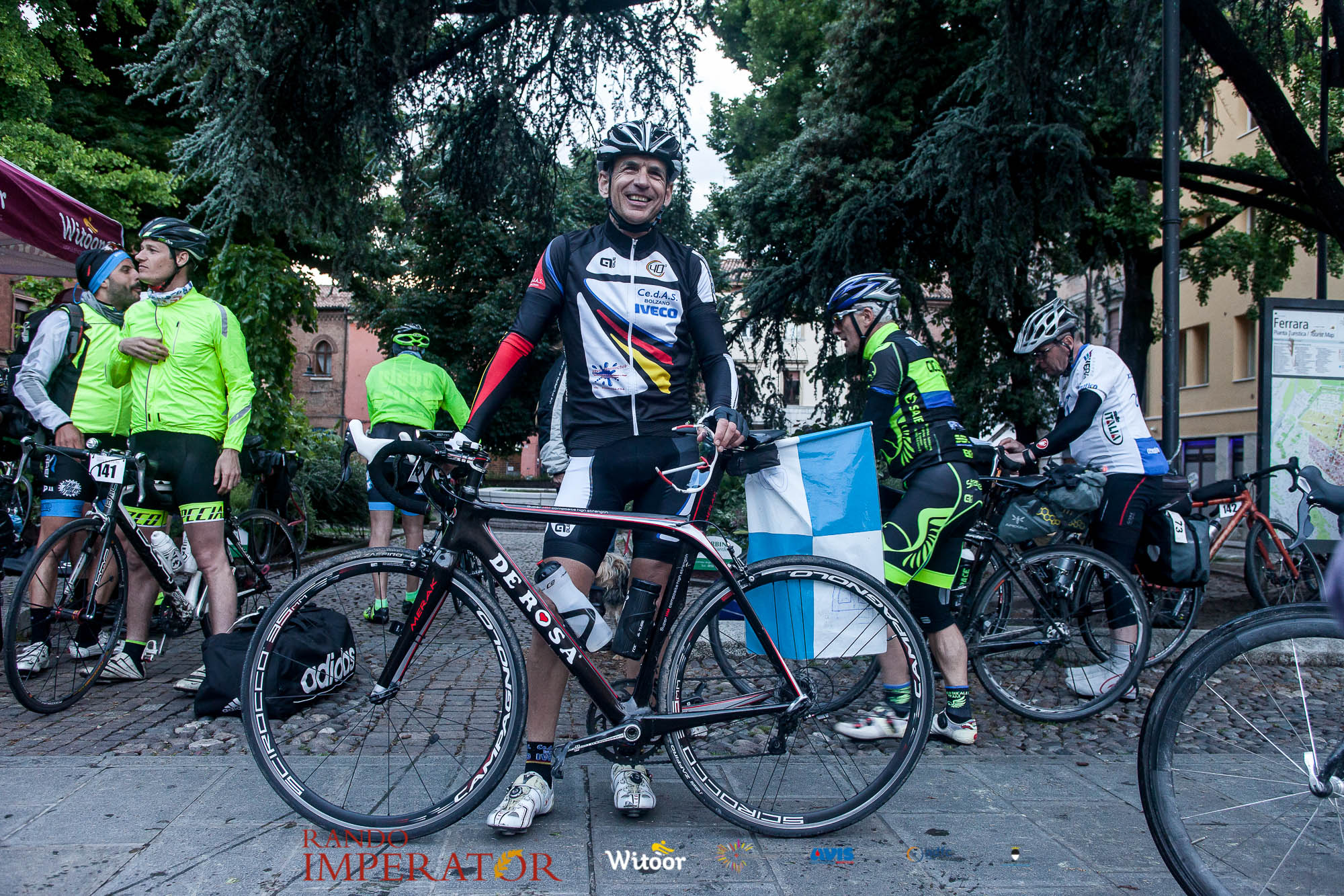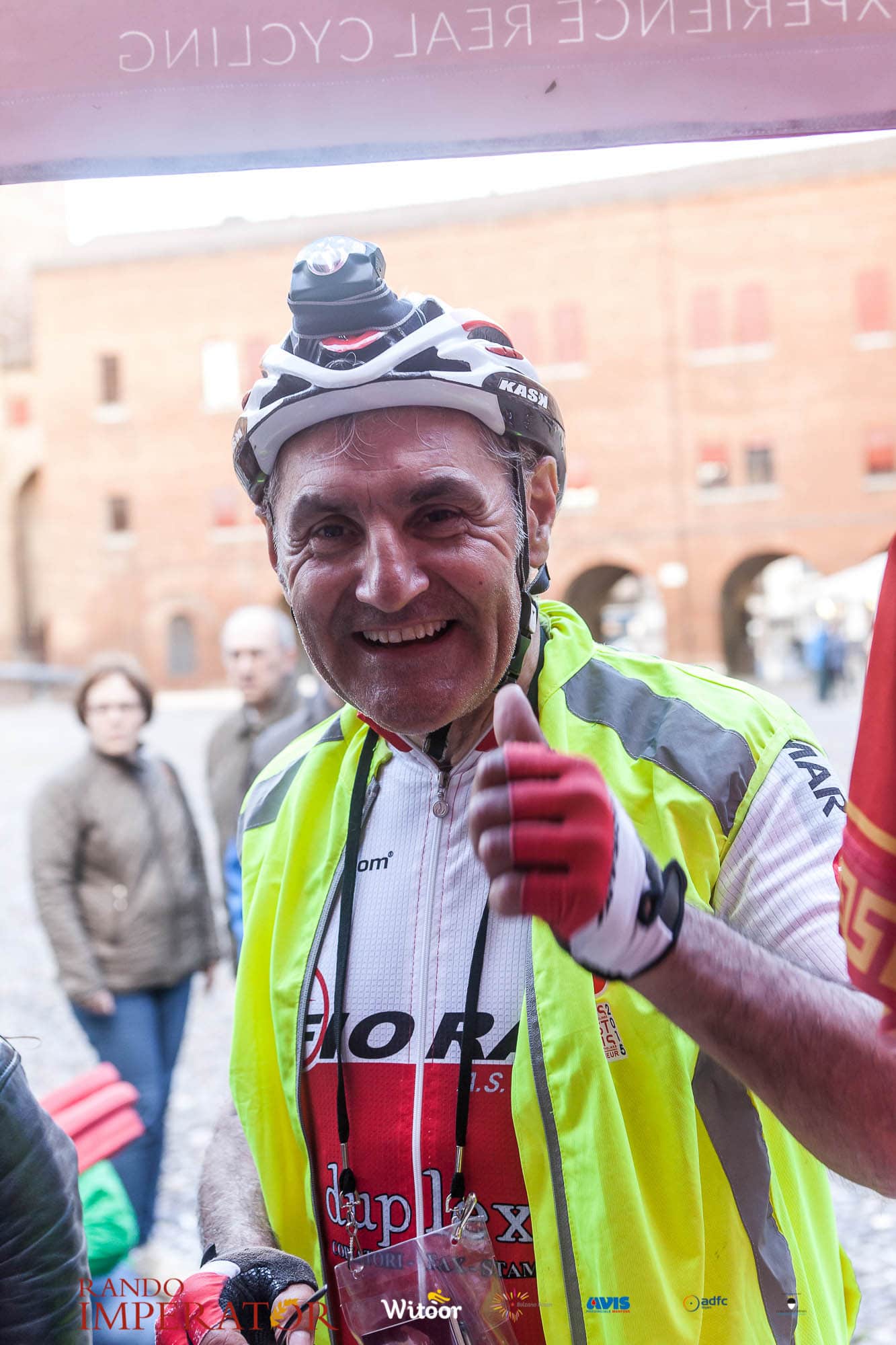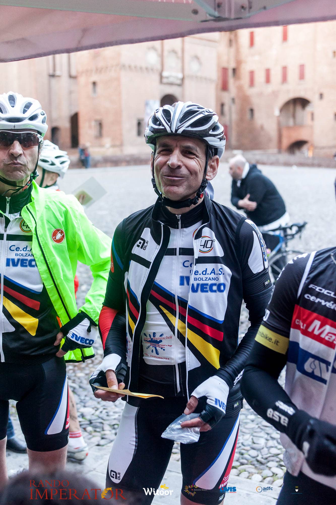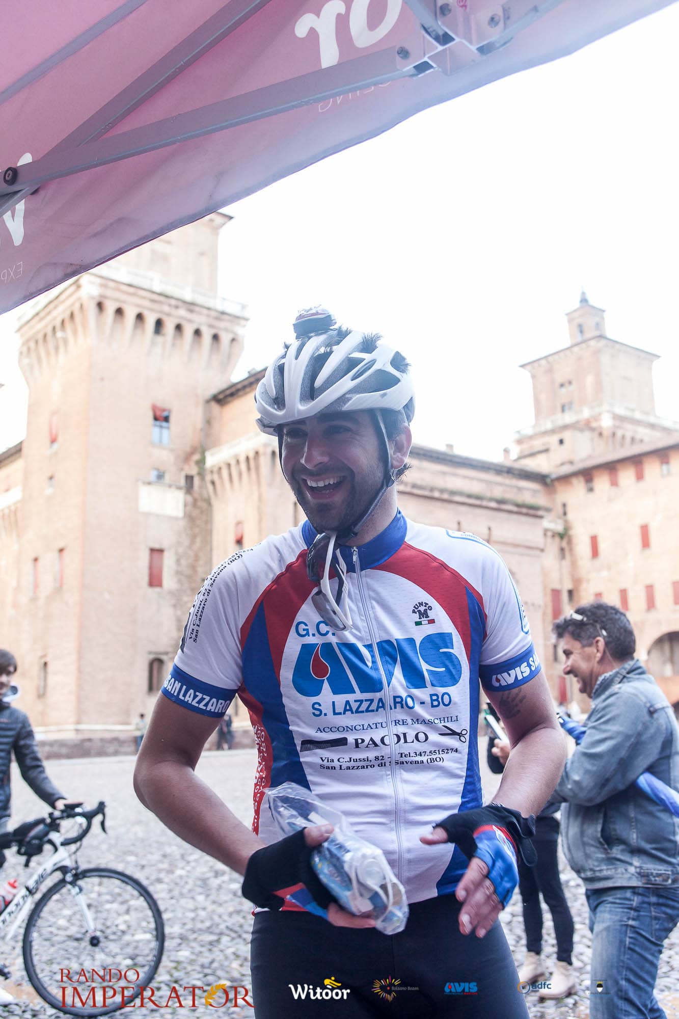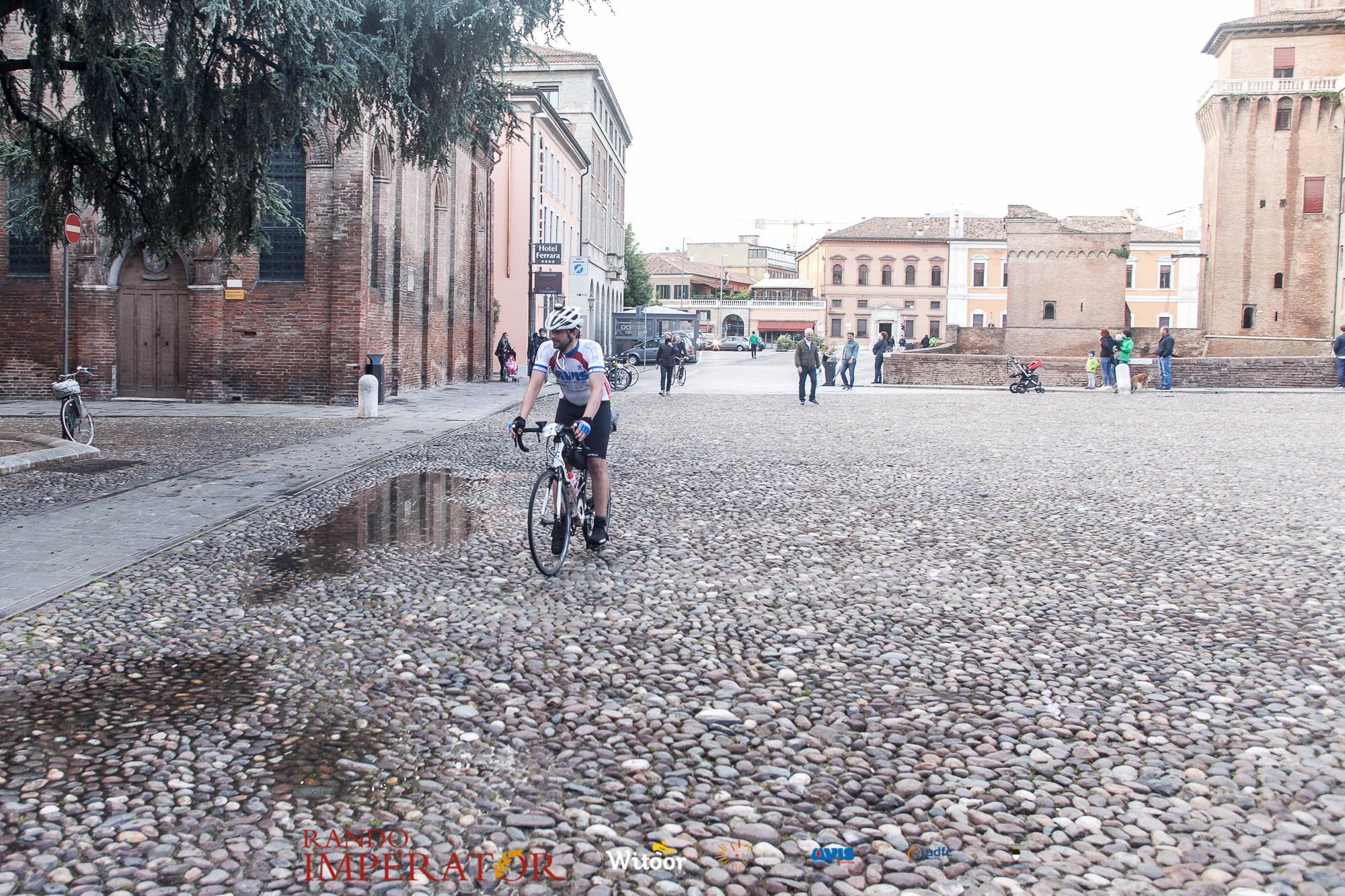 Ci siamo aiutati a infilarci i guanti gonfi di pioggia che proprio non ne volevano sapere di far passare le mani. Ce le siamo strette le mani, all’arrivo a Ferrara in piazza Castello, dopo un’infinità di strada percorsa. Ci siamo guardati negli occhi e ci siamo messi a ridere quando ci si incrociava in salita. Ci siamo abbracciati con chi ci ha aspettato per ore. Ci siamo detti “mai più”, “ci vediamo il prossimo anno”, “se bevo ancora un po’ di vino non riparto mica”. La bici è quella cosa che riesce a unire le persone, la Rando Imperator è quella randonnée che tiene stretti paesi e persone diverse, che ce la fanno o che non ce la fanno, questo poi è relativo. Conta dire grazie a tutti i partecipanti per l’impegno, la pazienza, per il modo che hanno di affrontare difficoltà e per insegnarci il vero spirito di randonneur.