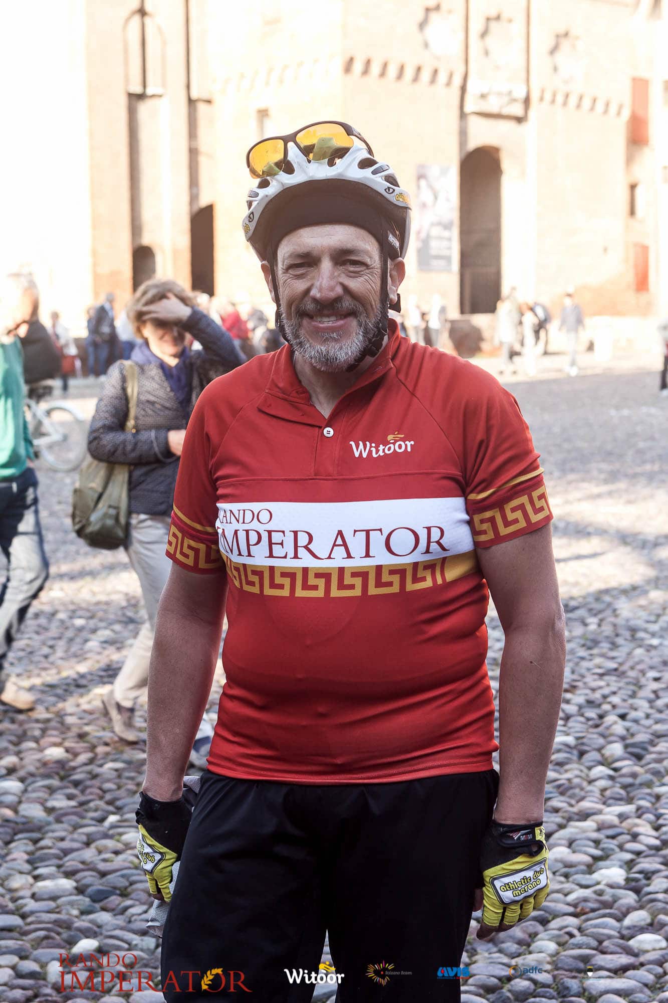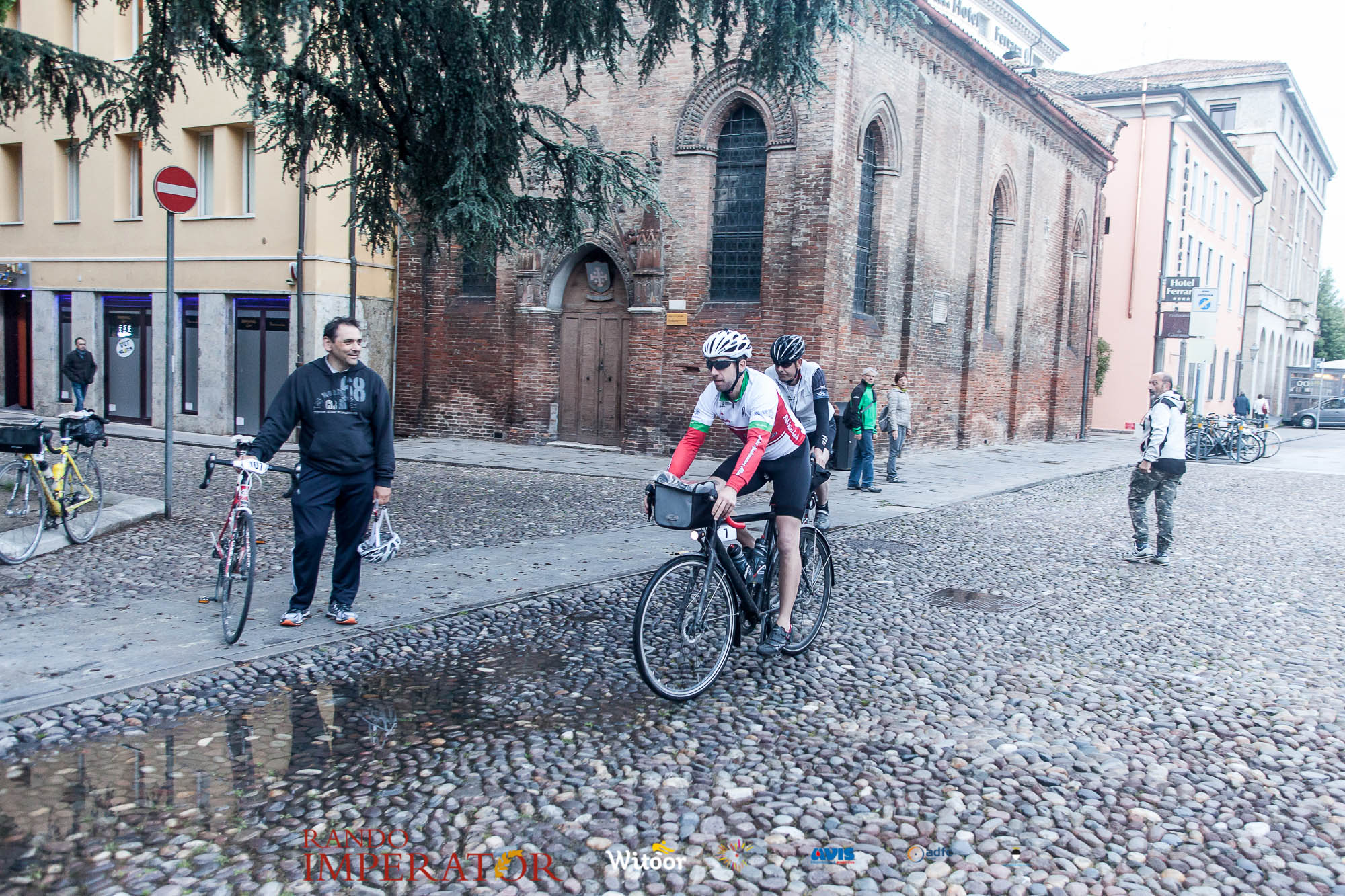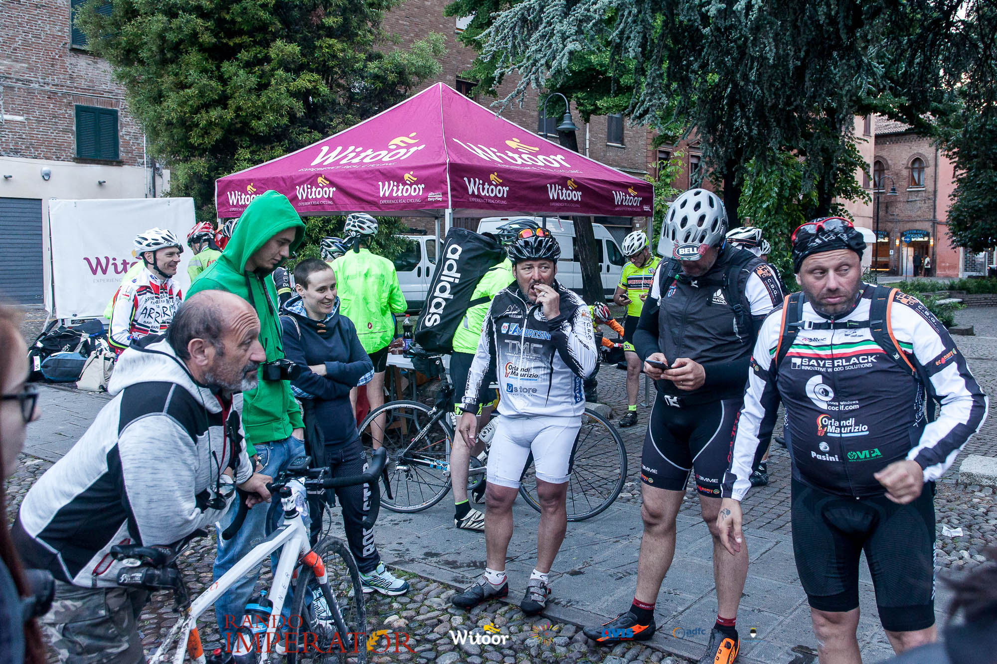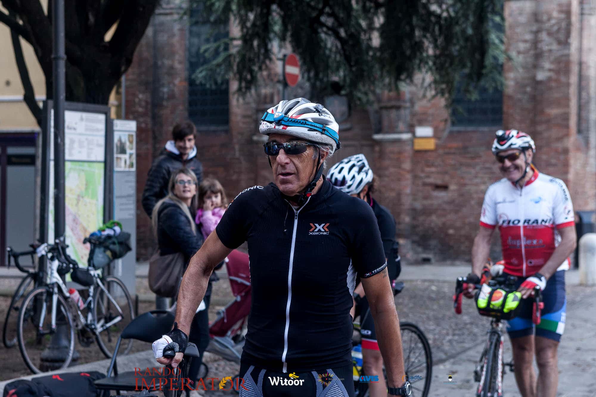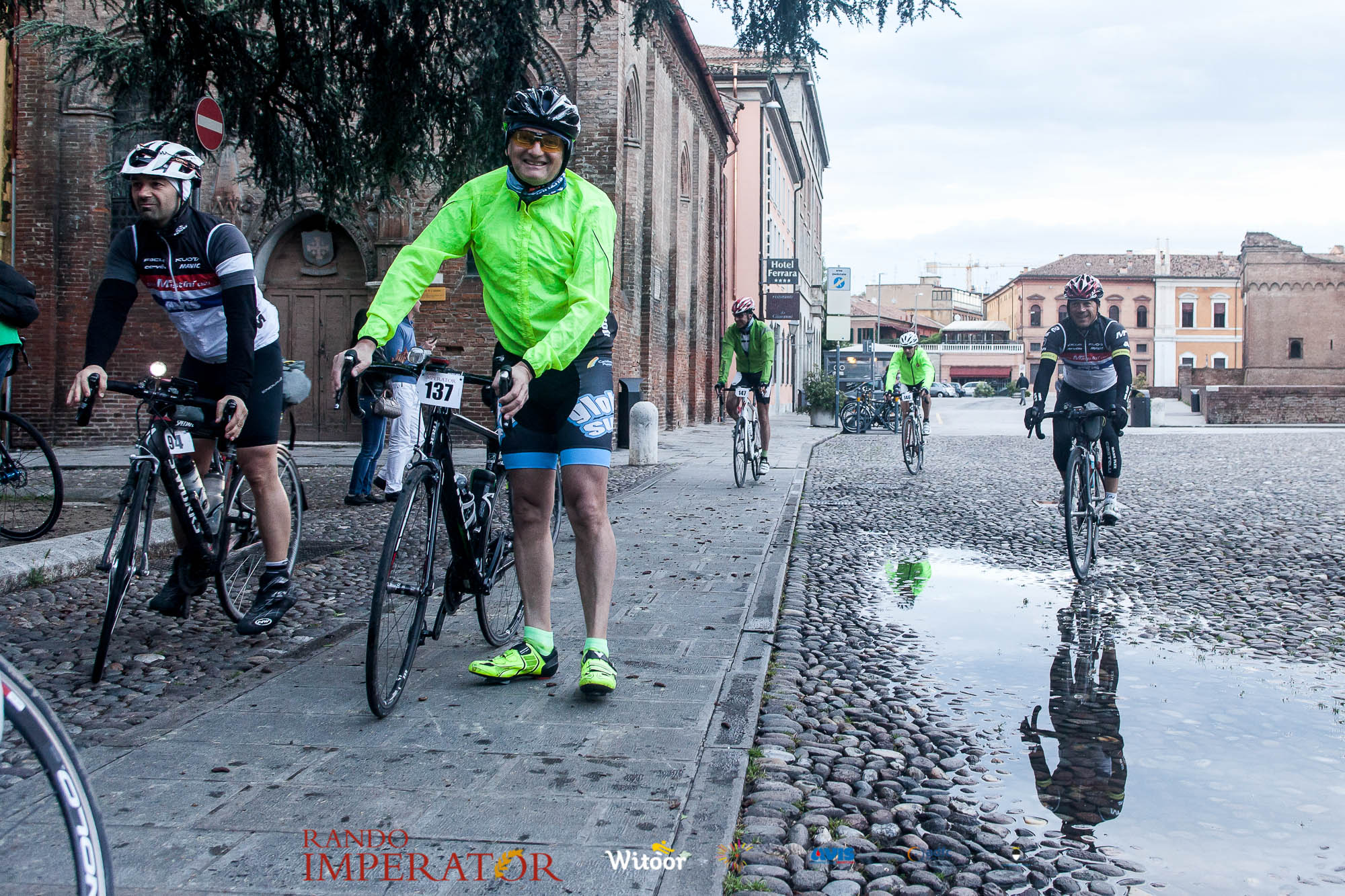 Ci siamo aiutati a infilarci i guanti gonfi di pioggia che proprio non ne volevano sapere di far passare le mani. Ce le siamo strette le mani, all’arrivo a Ferrara in piazza Castello, dopo un’infinità di strada percorsa. Ci siamo guardati negli occhi e ci siamo messi a ridere quando ci si incrociava in salita. Ci siamo abbracciati con chi ci ha aspettato per ore. Ci siamo detti “mai più”, “ci vediamo il prossimo anno”, “se bevo ancora un po’ di vino non riparto mica”. La bici è quella cosa che riesce a unire le persone, la Rando Imperator è quella randonnée che tiene stretti paesi e persone diverse, che ce la fanno o che non ce la fanno, questo poi è relativo. Conta dire grazie a tutti i partecipanti per l’impegno, la pazienza, per il modo che hanno di affrontare difficoltà e per insegnarci il vero spirito di randonneur.