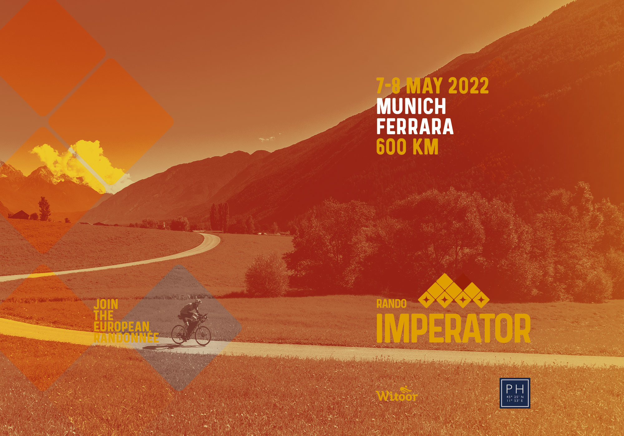 Sono aperte le iscrizioni alla Rando Imperator 2022, sabato 7 e domenica 8 maggio: tre brevetti, uno da 600 km da Monaco a Bolzano e Ferrara, due da 300 km (Monaco-Bolzano e Bolzano-Ferrara). Quest’anno particolarmente succosi, perché saranno utili per la pre-registrazione alla Paris-Brest-Paris 2023. Scegli il tuo brevetto sul nostro sito: fino al 31 gennaio l’iscrizione è in offerta speciale! Hai bisogno di un alloggio? Ti serve un passaggio in pullman a Bolzano o Monaco? Troverai tutti i servizi extra nel modulo di iscrizione.